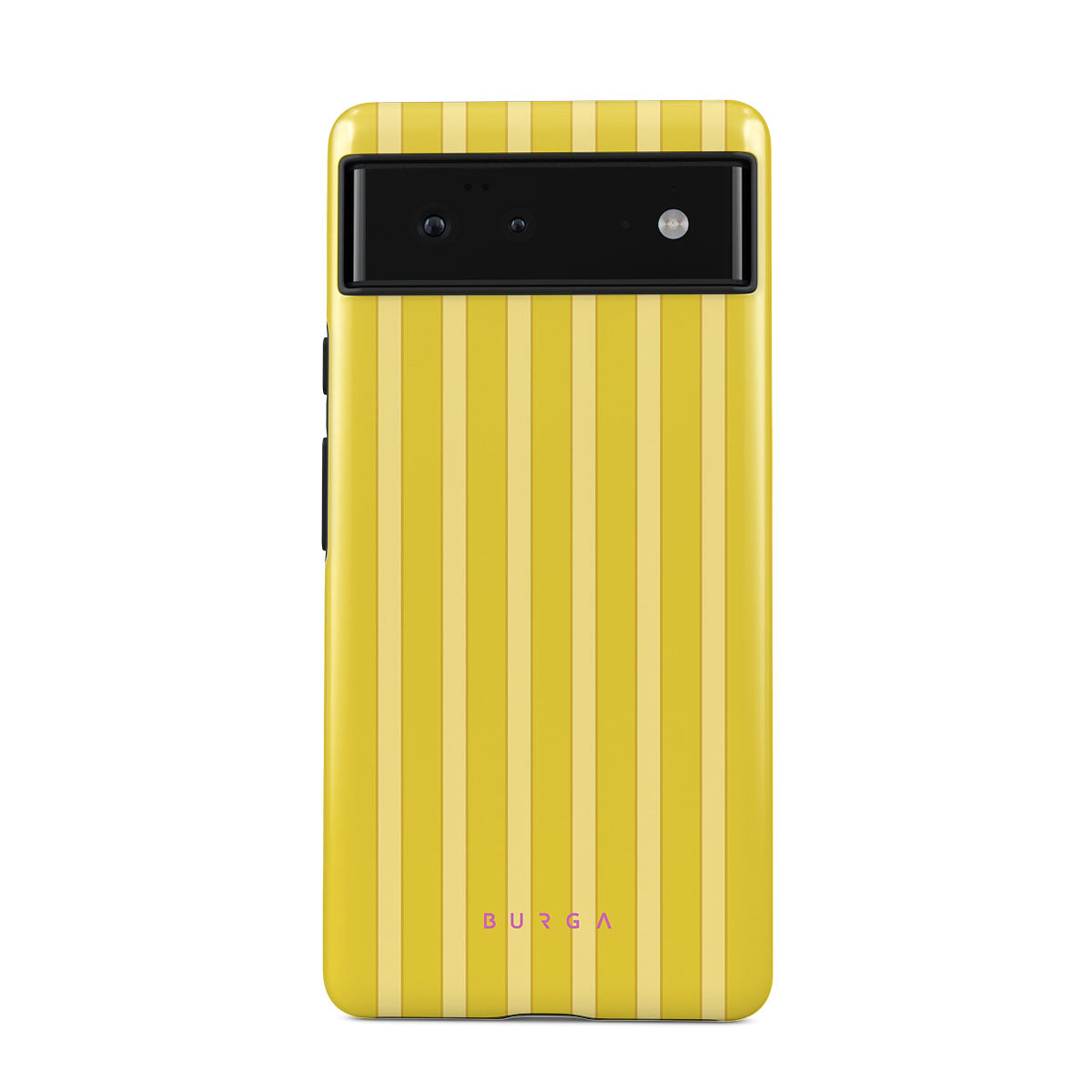 Bask in the glow of Sunbreak. This Google Pixel 6 phone case design features bold yellow stripes, reminiscent of beachside cabanas and sunny summer days. It’s a chic celebration of joy and simplicity.