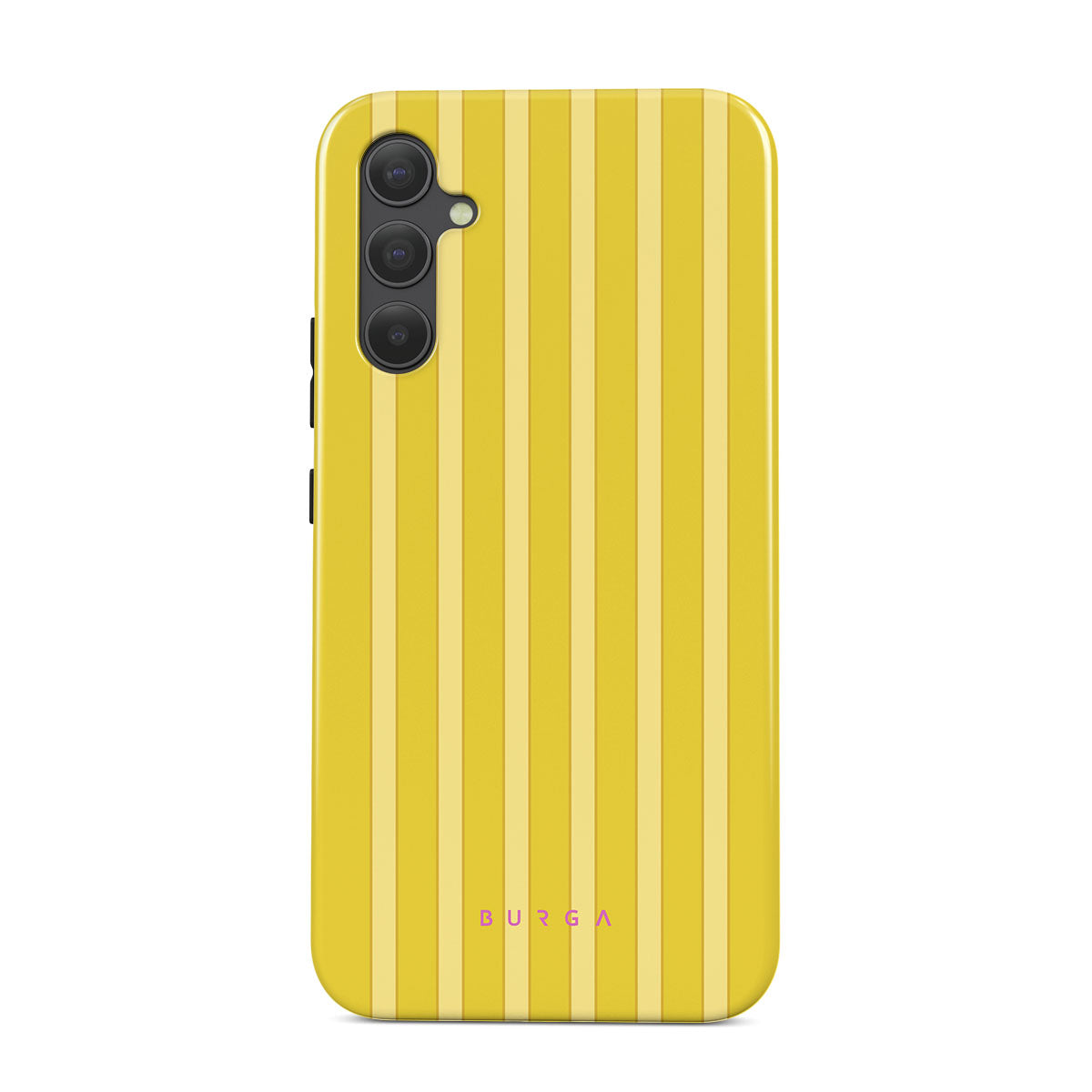 Bask in the glow of Sunbreak. This Samsung Galaxy A34 phone case design features bold yellow stripes, reminiscent of beachside cabanas and sunny summer days. It’s a chic celebration of joy and simplicity.