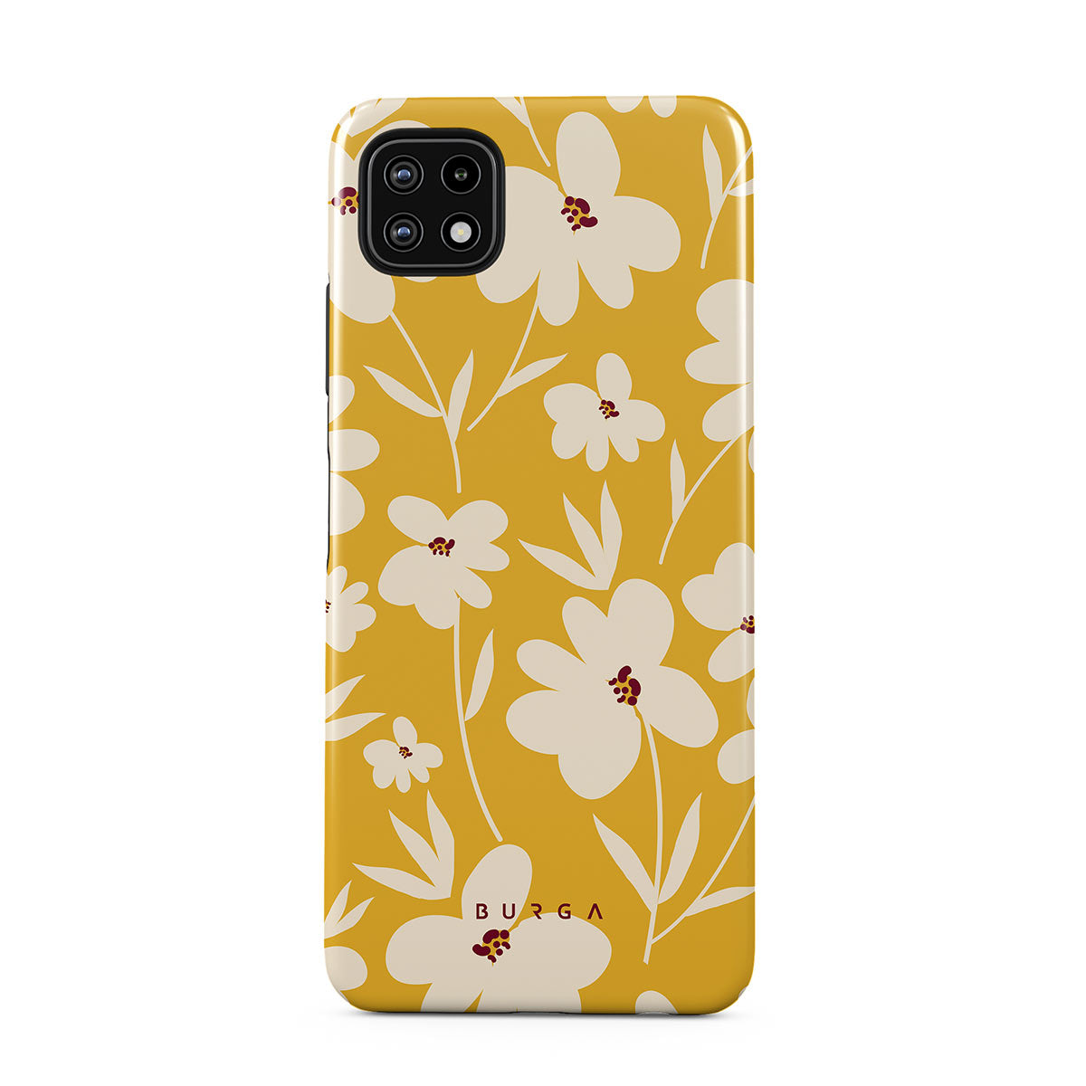 Full of fresh produce, warm rays of sunshine, and relaxing moments, our Sunday Market Samsung Galaxy A22 5G phone case encase all of this! The vintage mustard-yellow background with beautiful creme flowers will add that soft floral touch to your wardrobe while protecting your device from unexpected falls!