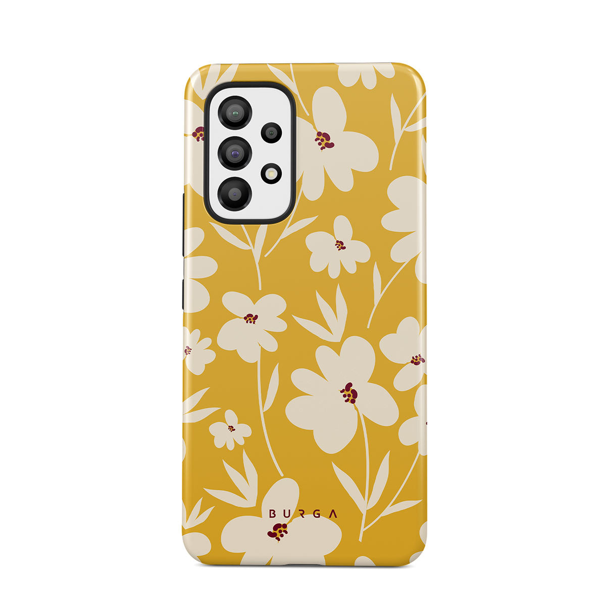 Full of fresh produce, warm rays of sunshine, and relaxing moments, our Sunday Market Samsung Galaxy A53 phone case encase all of this! The vintage mustard-yellow background with beautiful creme flowers will add that soft floral touch to your wardrobe while protecting your device from unexpected falls!
