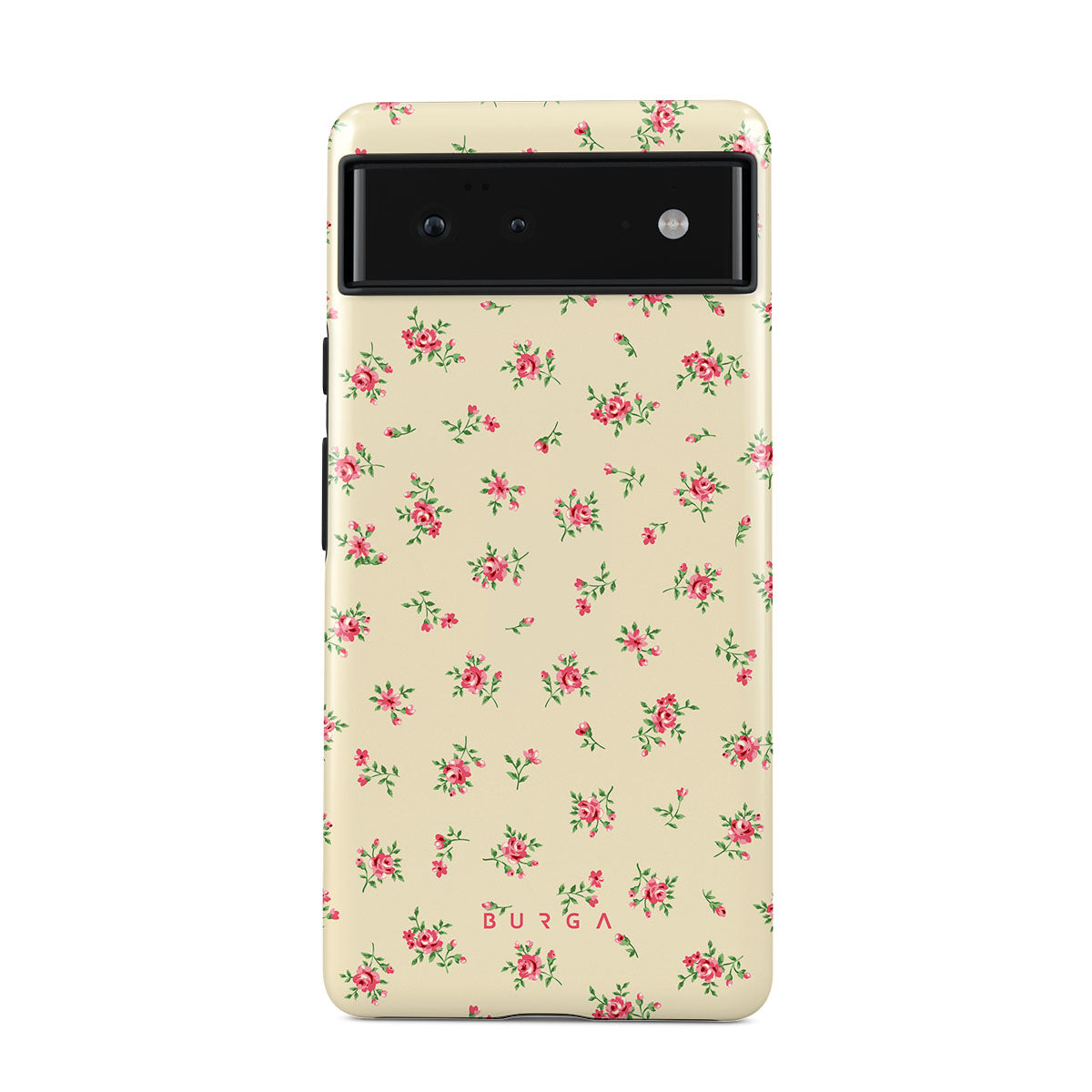 A daydream of soft pink petals on creamy yellow, reminiscent of that perfect light dress, twirling in the golden light of a lazy afternoon—that’s the Sundress Google Pixel 6a phone case design.