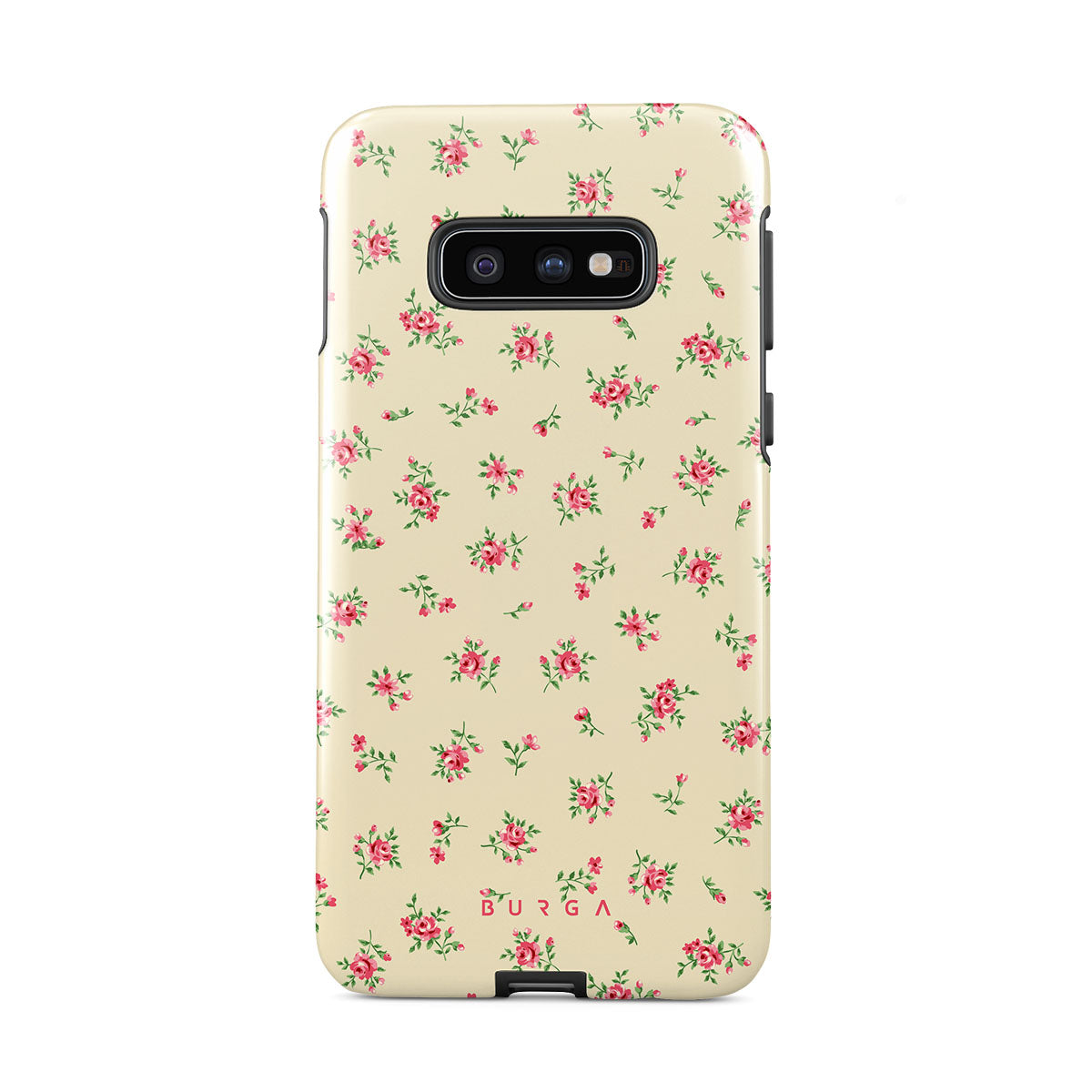 A daydream of soft pink petals on creamy yellow, reminiscent of that perfect light dress, twirling in the golden light of a lazy afternoon—that’s the Sundress Samsung Galaxy S10E phone case design.