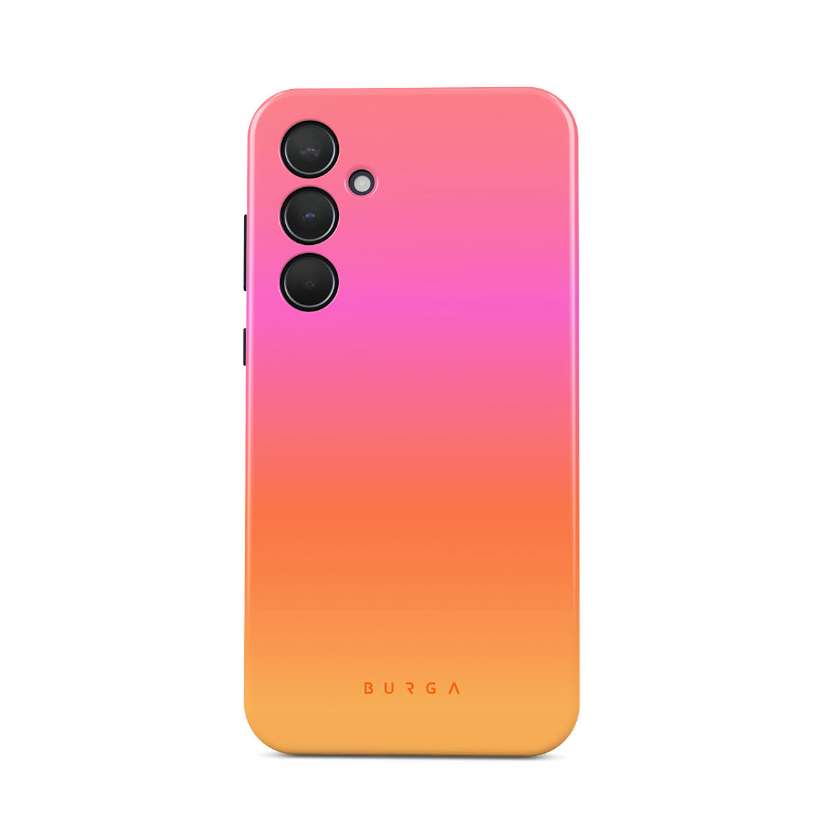 This Sunset Club Samsung Galaxy A35 phone case captures the mesmerizing hues of a fading sun, blending fiery oranges and passionate pinks that dance like the horizon at dusk. It's an everyday tribute to the light’s farewell kiss.