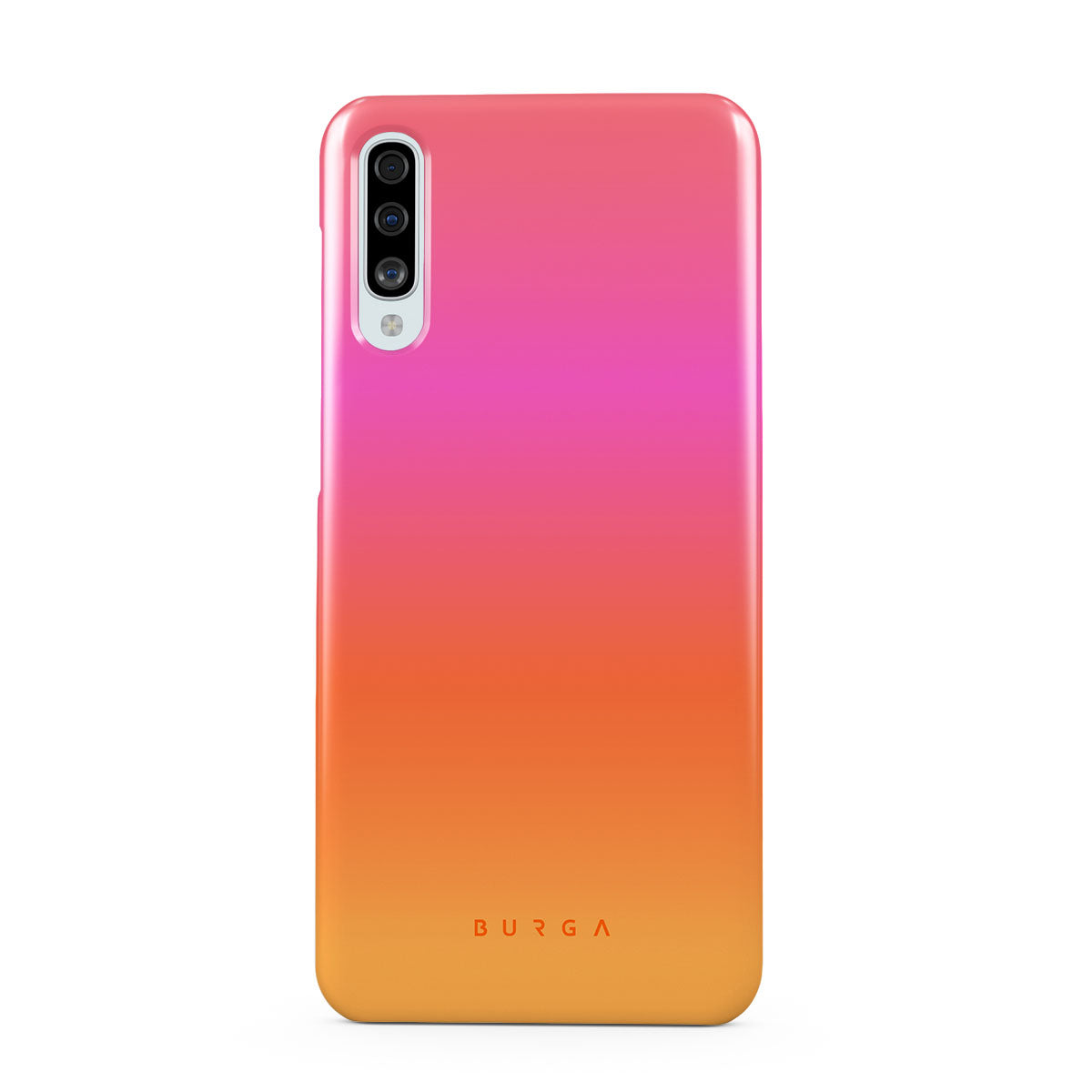 This Sunset Club Samsung Galaxy A50 phone case captures the mesmerizing hues of a fading sun, blending fiery oranges and passionate pinks that dance like the horizon at dusk. It's an everyday tribute to the light’s farewell kiss.