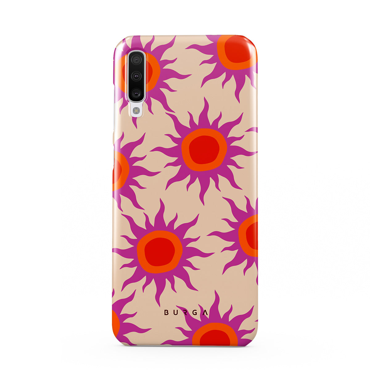 Discover the radiant serenity of the Sunset Glow design, a harmonious blend of soothing pastels and fiery suns. Vivacious viva magenta rays add a playful touch, perfectly balancing tranquility and dynamism. More than just a fashion accessory, this striking Samsung Galaxy A70 phone case mirrors your unique personality and zest for life.
