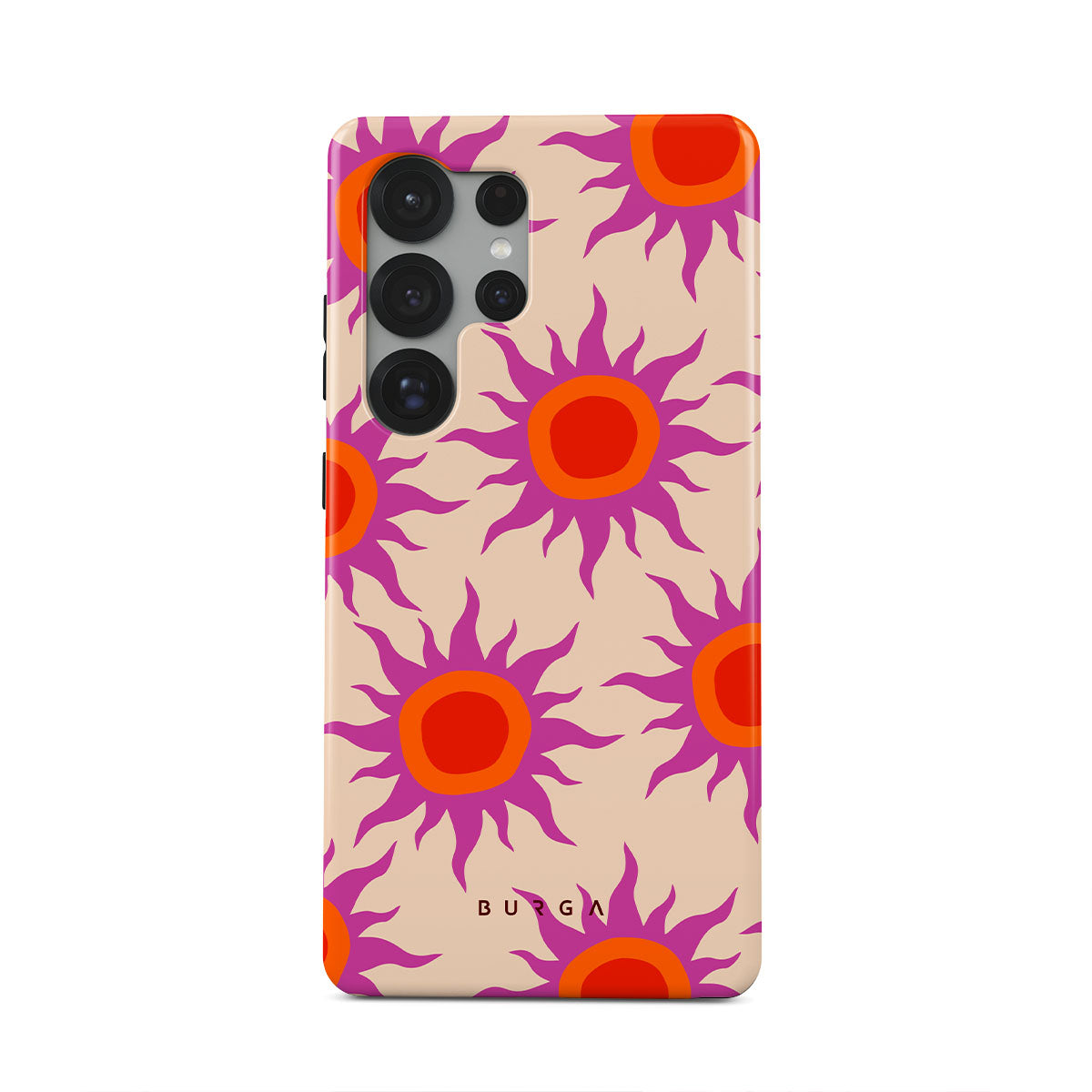 Discover the radiant serenity of the Sunset Glow design, a harmonious blend of soothing pastels and fiery suns. Vivacious viva magenta rays add a playful touch, perfectly balancing tranquility and dynamism. More than just a fashion accessory, this striking Samsung Galaxy S25 Ultra phone case mirrors your unique personality and zest for life.