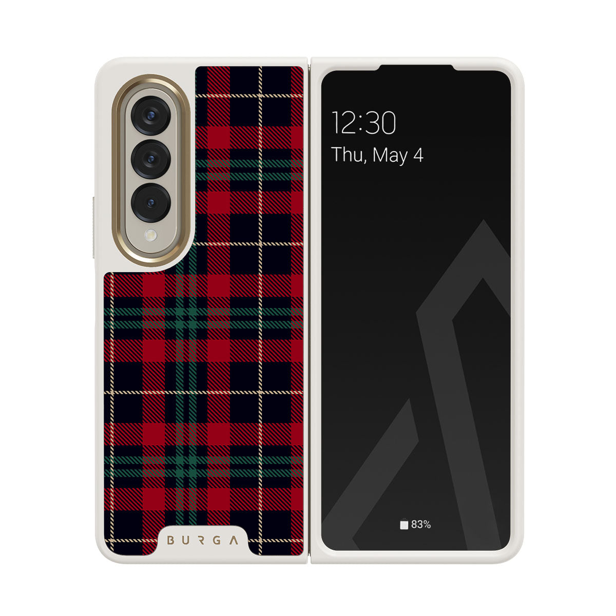 Our Sweater Weather design blends the classic appeal of plaid with the cozy comfort of a holiday sweater, featuring deep reds, navy, and greens. This timeless pattern keeps your Samsung Galaxy Z Fold 4 Case phone case snug and stylish, echoing enduring elegance that lasts all year round.