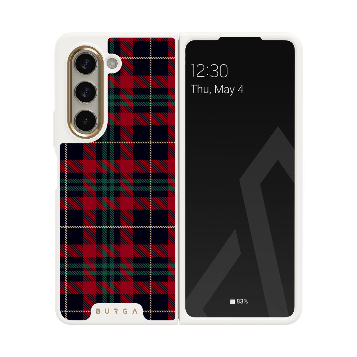Our Sweater Weather design blends the classic appeal of plaid with the cozy comfort of a holiday sweater, featuring deep reds, navy, and greens. This timeless pattern keeps your Samsung Galaxy Z Fold 5 Case phone case snug and stylish, echoing enduring elegance that lasts all year round.
