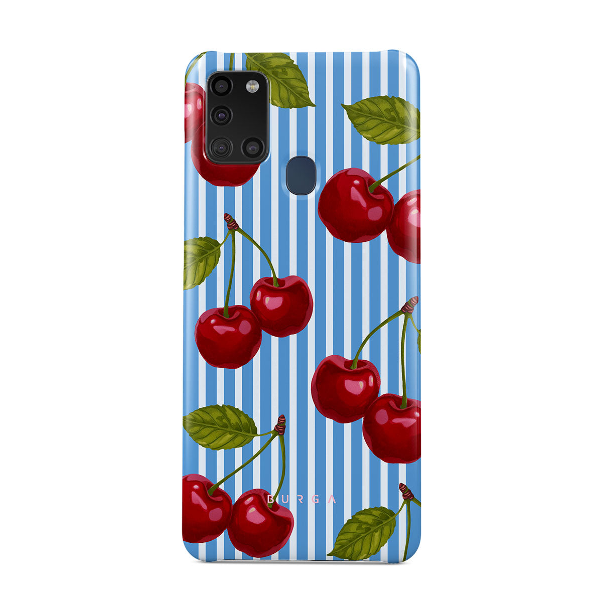 Cherries dangle like earrings from blue skies, a fun reminder of that first bite of summer, juicy and bursting with laughter. Meet our Sweet Moment Samsung Galaxy A21s 4G phone case design.