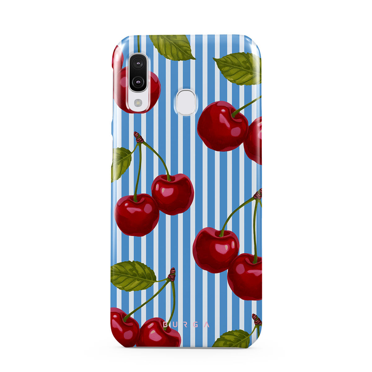 Cherries dangle like earrings from blue skies, a fun reminder of that first bite of summer, juicy and bursting with laughter. Meet our Sweet Moment Samsung Galaxy A40 phone case design.