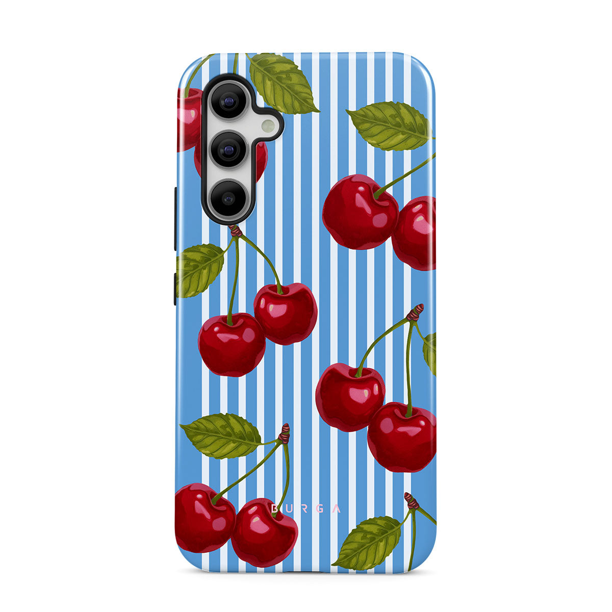 Cherries dangle like earrings from blue skies, a fun reminder of that first bite of summer, juicy and bursting with laughter. Meet our Sweet Moment Samsung Galaxy A54 phone case design.