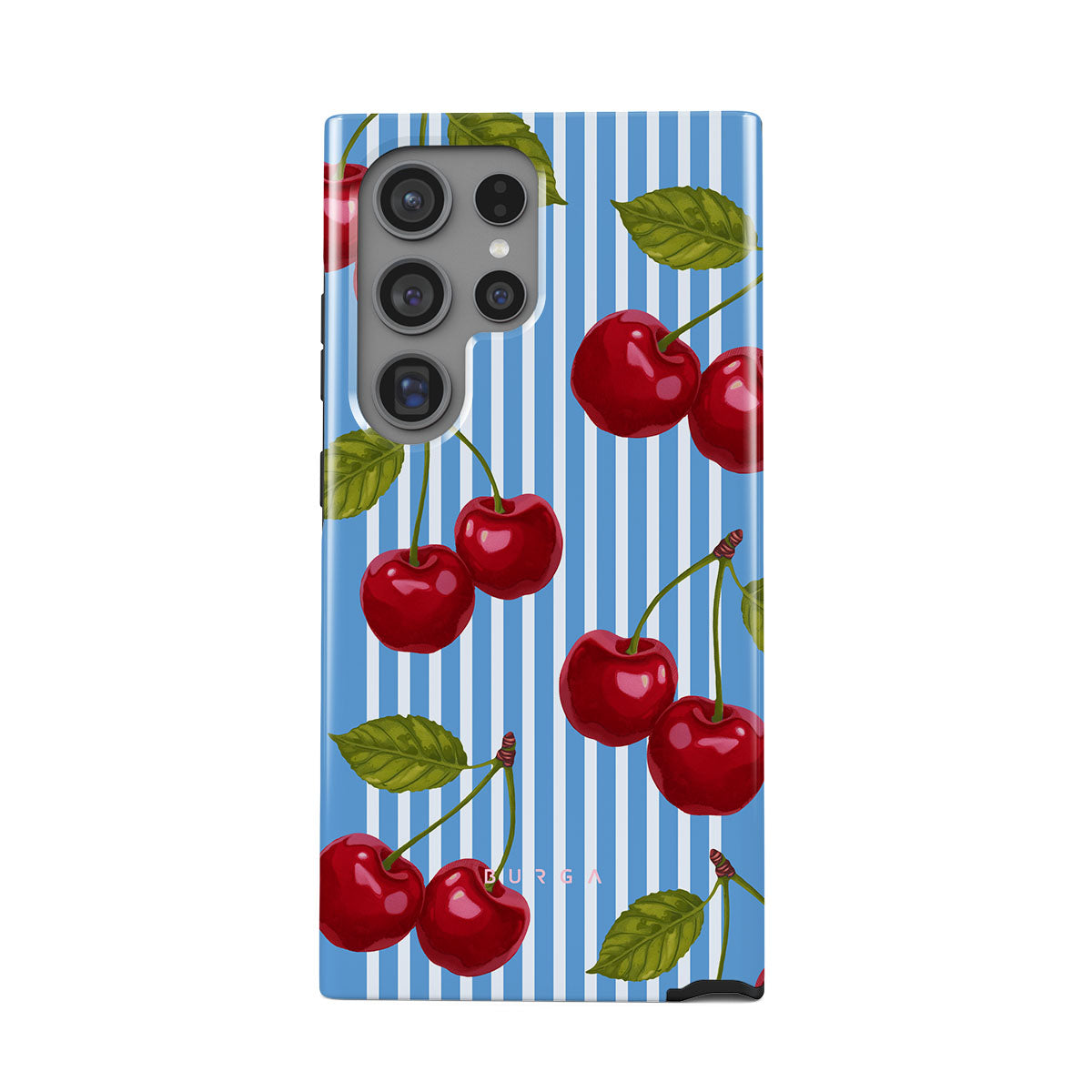 Cherries dangle like earrings from blue skies, a fun reminder of that first bite of summer, juicy and bursting with laughter. Meet our Sweet Moment Samsung Galaxy S24 Ultra phone case design.