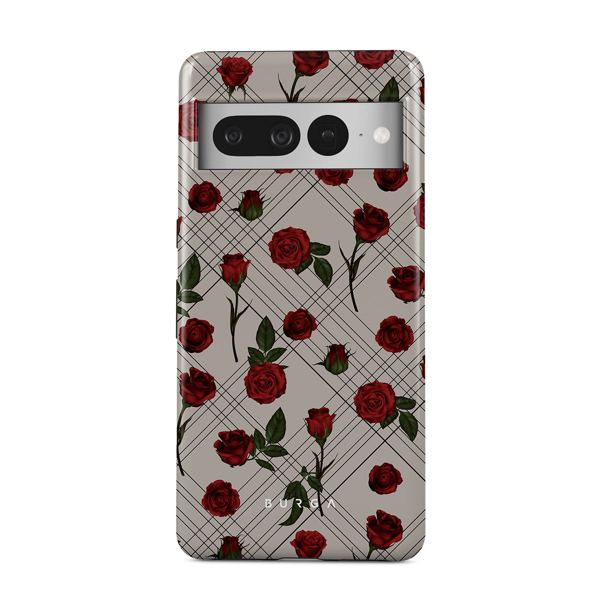 Embrace the subtle rebellion of our Sweet Sin Google Pixel 7 Pro phone case design. On a muted nude-gray canvas, scattered small red roses hint at passions hidden beneath the surface. A design that balances the delicate with the daring. Crafted for those who find beauty in the unexpected and wear their edge with elegance.