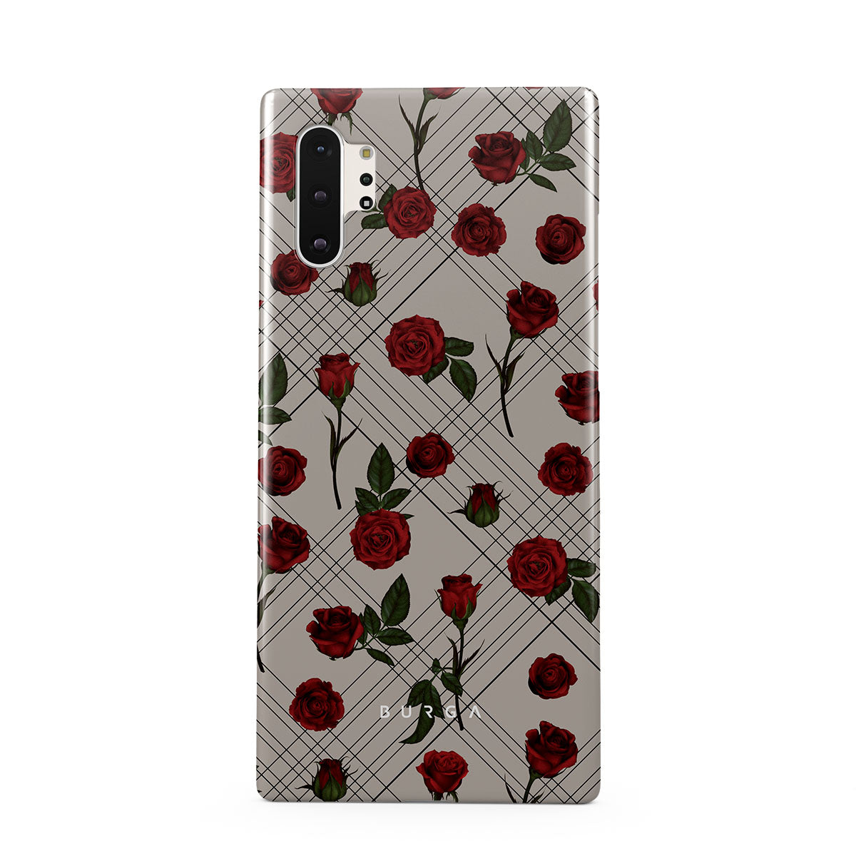 Embrace the subtle rebellion of our Sweet Sin Samsung Galaxy Note 10 Plus phone case design. On a muted nude-gray canvas, scattered small red roses hint at passions hidden beneath the surface. A design that balances the delicate with the daring. Crafted for those who find beauty in the unexpected and wear their edge with elegance.