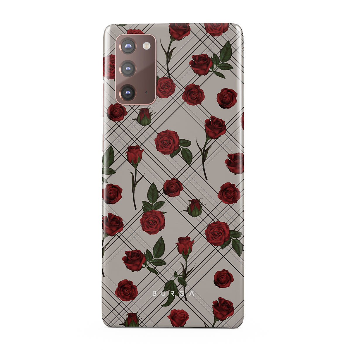 Embrace the subtle rebellion of our Sweet Sin Samsung Galaxy Note 20 4G / 5G phone case design. On a muted nude-gray canvas, scattered small red roses hint at passions hidden beneath the surface. A design that balances the delicate with the daring. Crafted for those who find beauty in the unexpected and wear their edge with elegance.