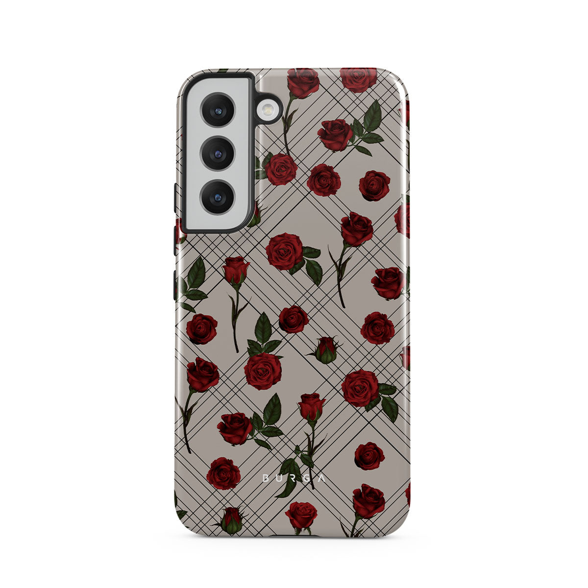Embrace the subtle rebellion of our Sweet Sin Samsung Galaxy S22 Plus phone case design. On a muted nude-gray canvas, scattered small red roses hint at passions hidden beneath the surface. A design that balances the delicate with the daring. Crafted for those who find beauty in the unexpected and wear their edge with elegance.