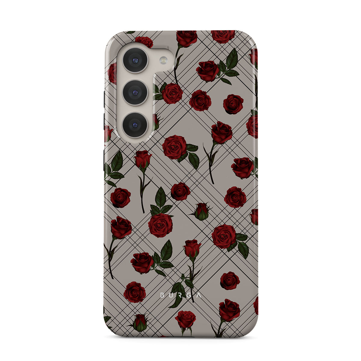 Embrace the subtle rebellion of our Sweet Sin Samsung Galaxy S23 phone case design. On a muted nude-gray canvas, scattered small red roses hint at passions hidden beneath the surface. A design that balances the delicate with the daring. Crafted for those who find beauty in the unexpected and wear their edge with elegance.