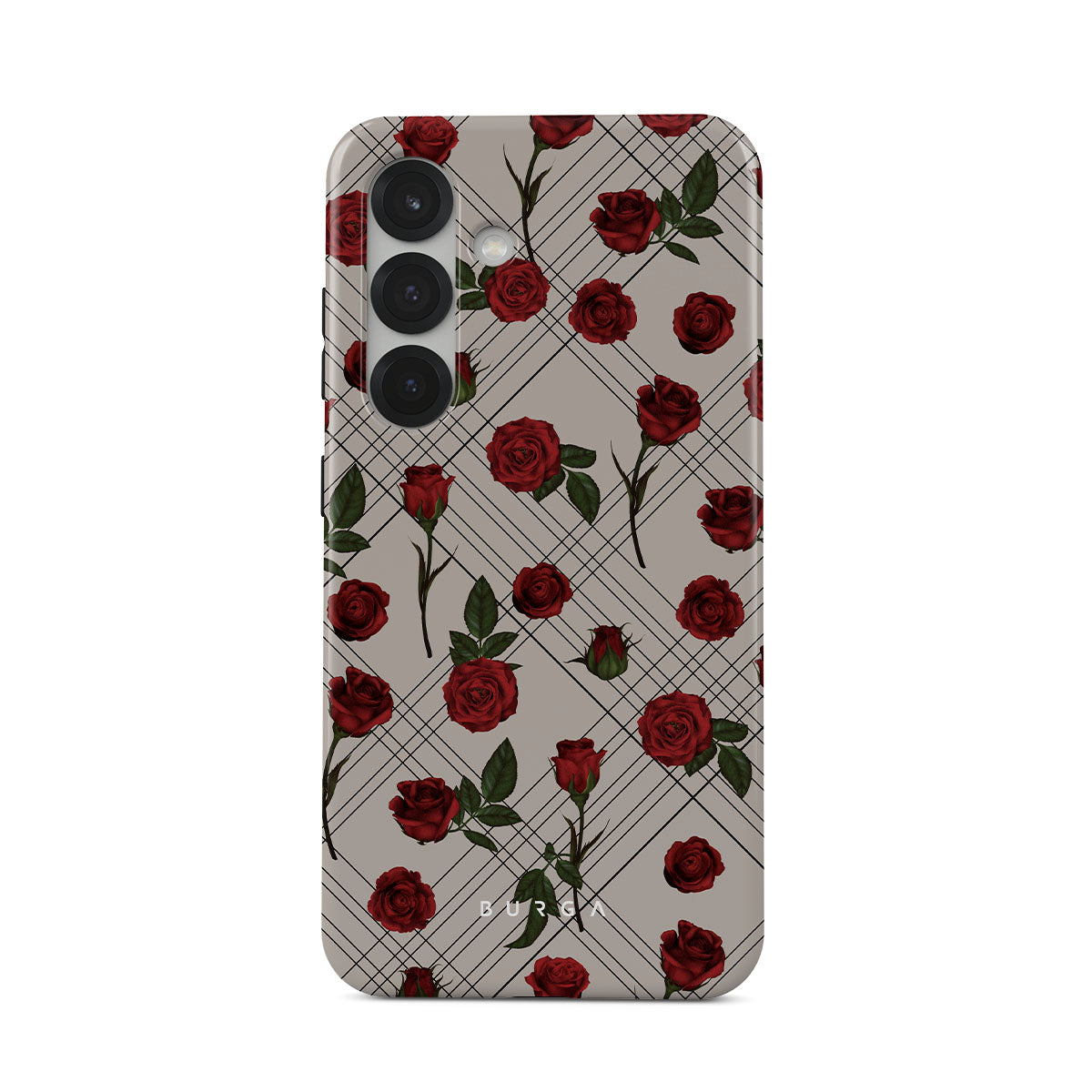 Embrace the subtle rebellion of our Sweet Sin Samsung Galaxy S25 phone case design. On a muted nude-gray canvas, scattered small red roses hint at passions hidden beneath the surface. A design that balances the delicate with the daring. Crafted for those who find beauty in the unexpected and wear their edge with elegance.