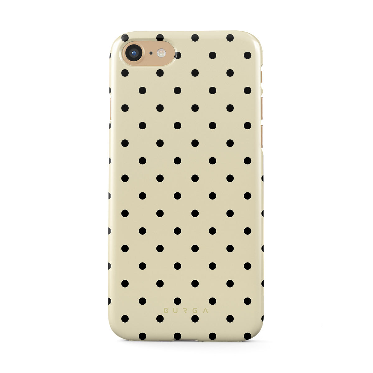 This design features: beige background with small black polka dots.