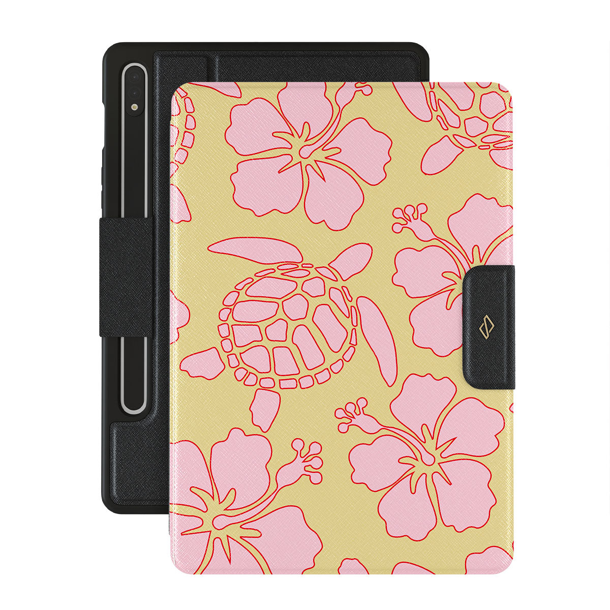 The Tan Break Samsung Galaxy Tab S8/S7 folio case features a vibrant design with pink flowers and sea turtles on a sunny yellow background. This tropical-inspired pattern exudes a laid-back, beachy vibe, perfect for those who love vibrant and nature-themed aesthetics.