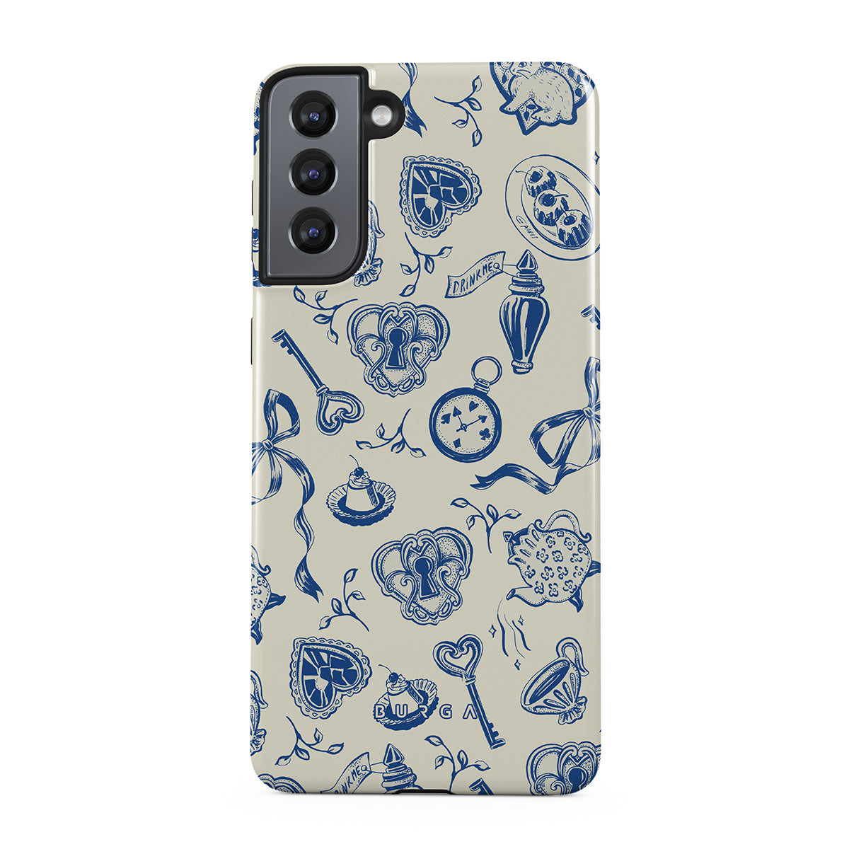 The Tea Party Samsung Galaxy S21 phone case design is a porcelain puzzle—ribbons tangled, time warped, rules rewritten. Sit down, pour a cup, but don’t expect things to make sense. They never do.