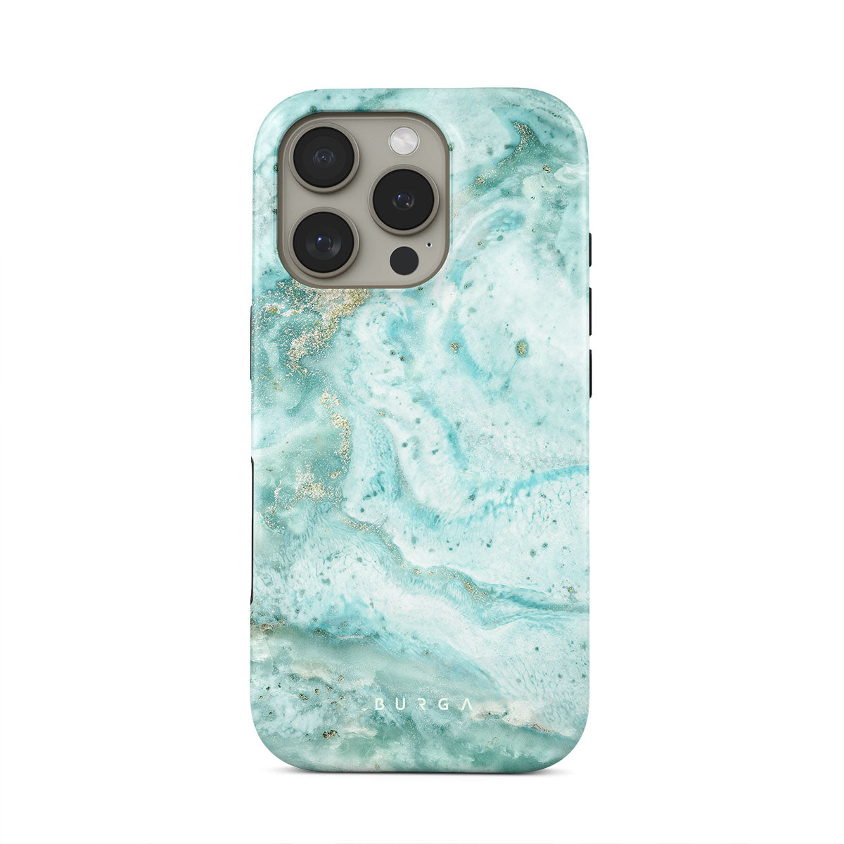 Our Uluwatu Waves iPhone 16 Pro phone case is an absolute teal dream. This phone cover features timeless and soft blue marble pattern enriched with golden color specks will surely remind you of a tropical beach teal waters while becoming a protective best friend for your cell phone.