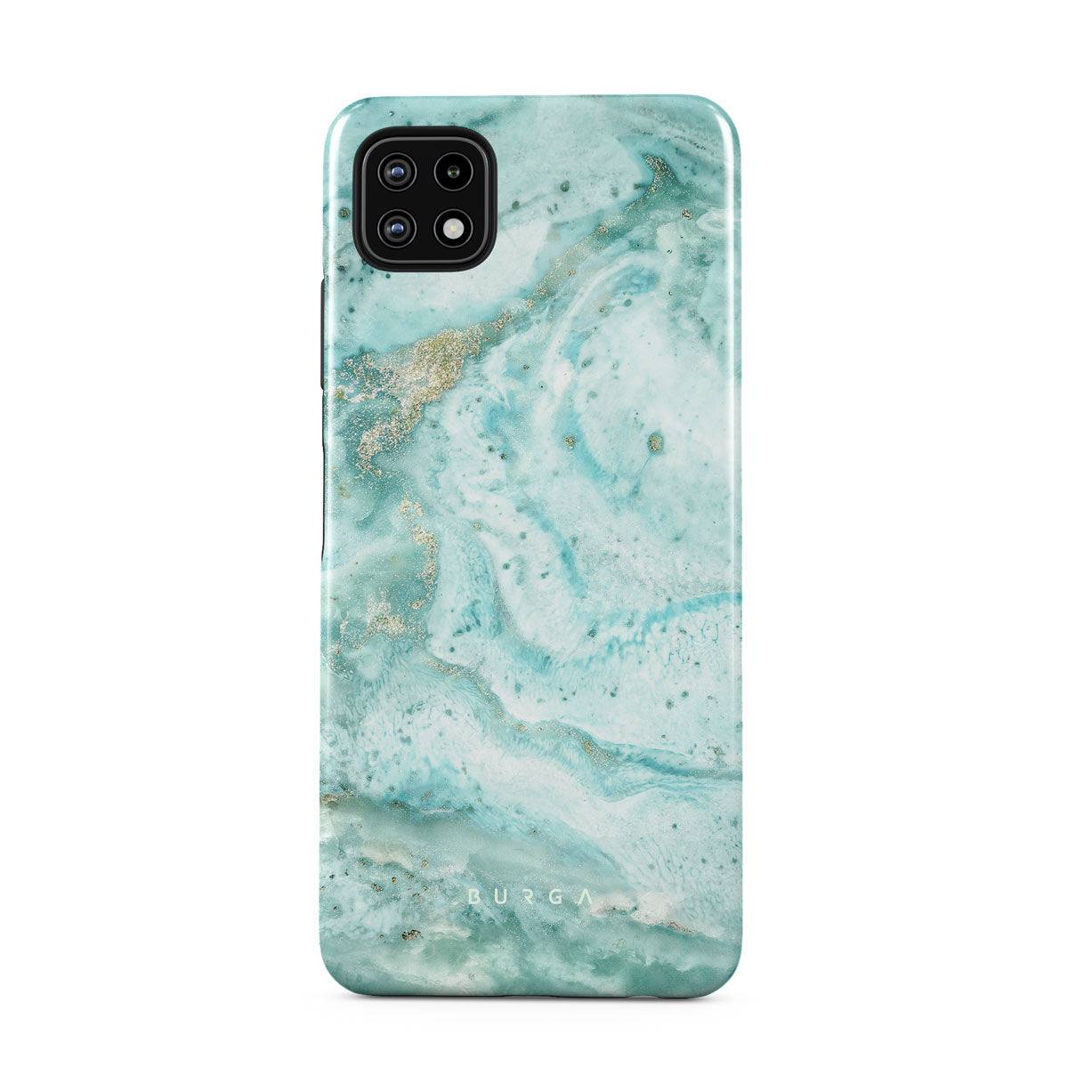 Our Uluwatu Waves Samsung Galaxy A22 5G phone case is an absolute teal dream. This phone cover features timeless and soft blue marble pattern enriched with golden color specks will surely remind you of a tropical beach teal waters while becoming a protective best friend for your cell phone.