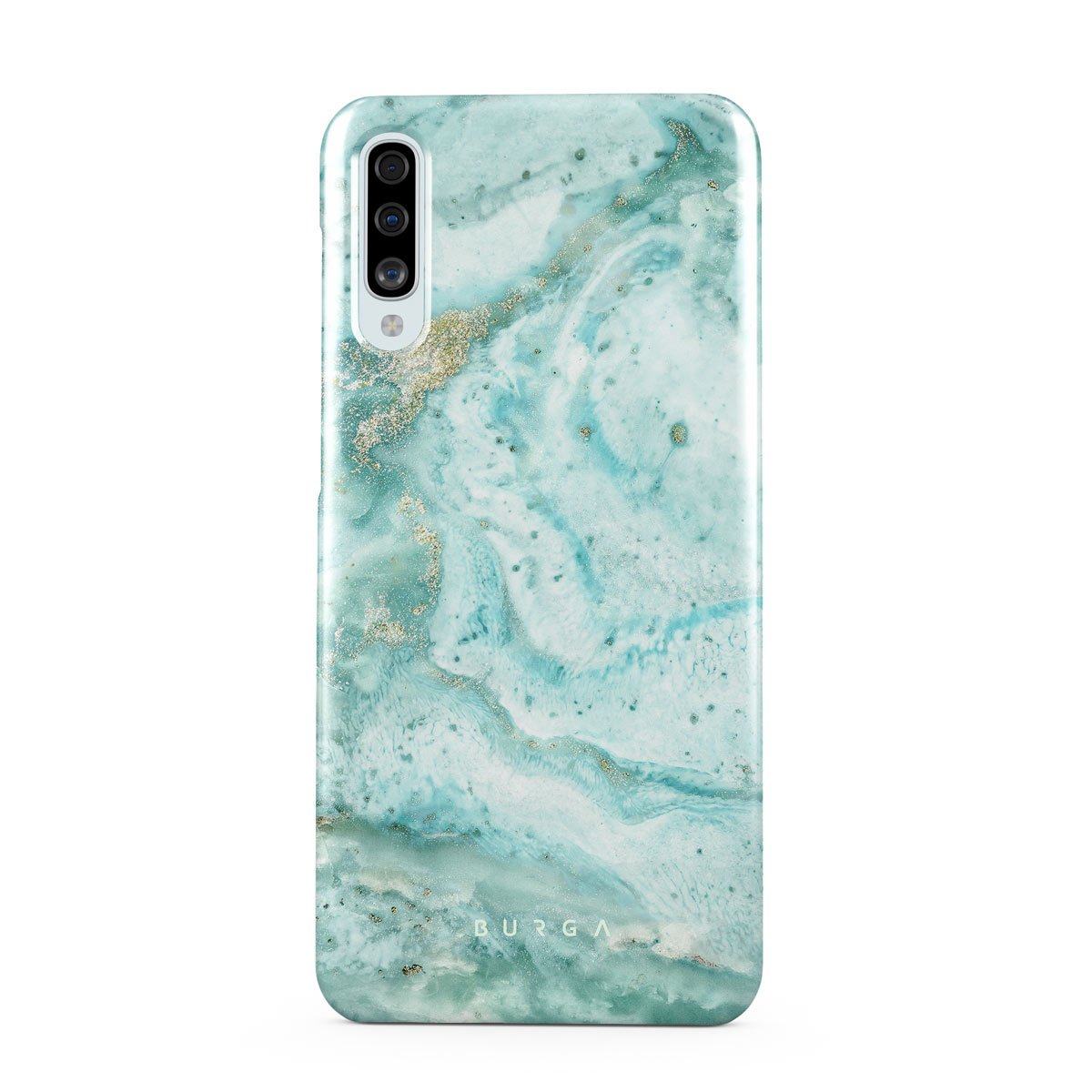Our Uluwatu Waves Samsung Galaxy A50 phone case is an absolute teal dream. This phone cover features timeless and soft blue marble pattern enriched with golden color specks will surely remind you of a tropical beach teal waters while becoming a protective best friend for your cell phone.