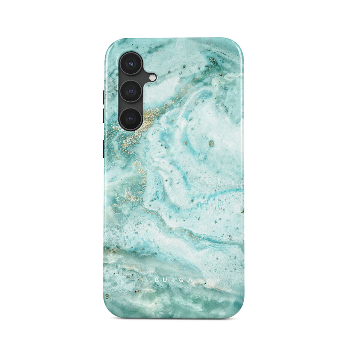 Our Uluwatu Waves Samsung Galaxy S23 FE phone case is an absolute teal dream. This phone cover features timeless and soft blue marble pattern enriched with golden color specks will surely remind you of a tropical beach teal waters while becoming a protective best friend for your cell phone.
