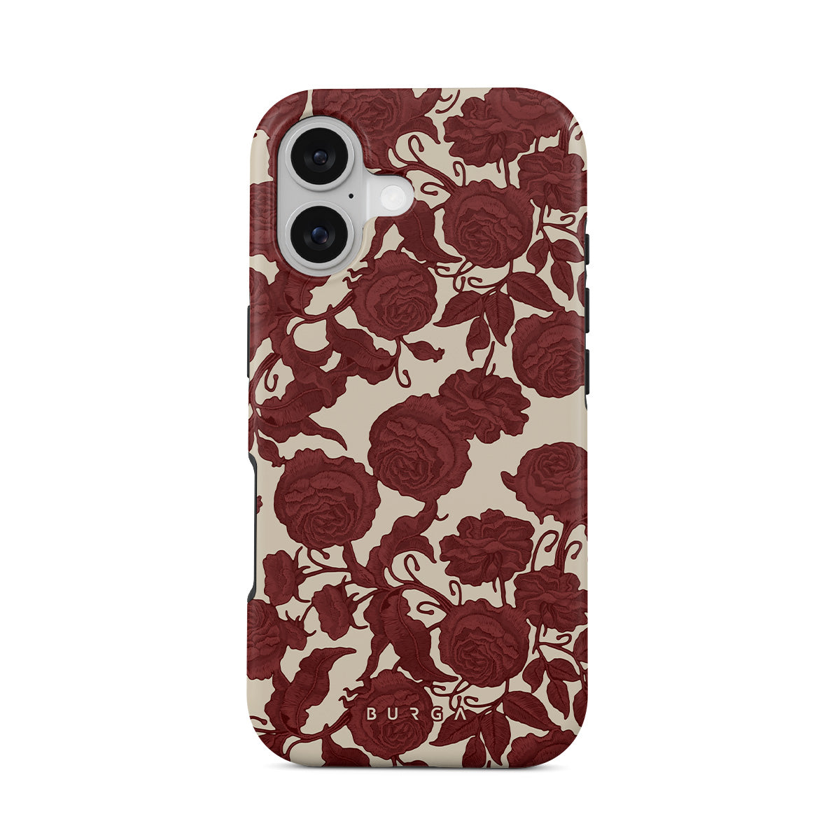 This design features: dark red roses, intricate floral pattern, vintage pattern