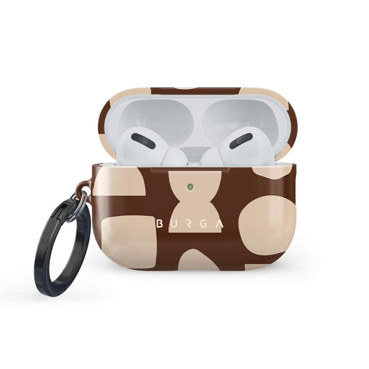 Our Terracotta Apple AirPods Pro 3 case cover design whispers warmth and grounded energy. Against a rich brown background, an interplay of light shapes unfolds, captivating the eye with an array of circles, squares, and hourglasses. Each shape is a testament to the beauty found in simplicity.