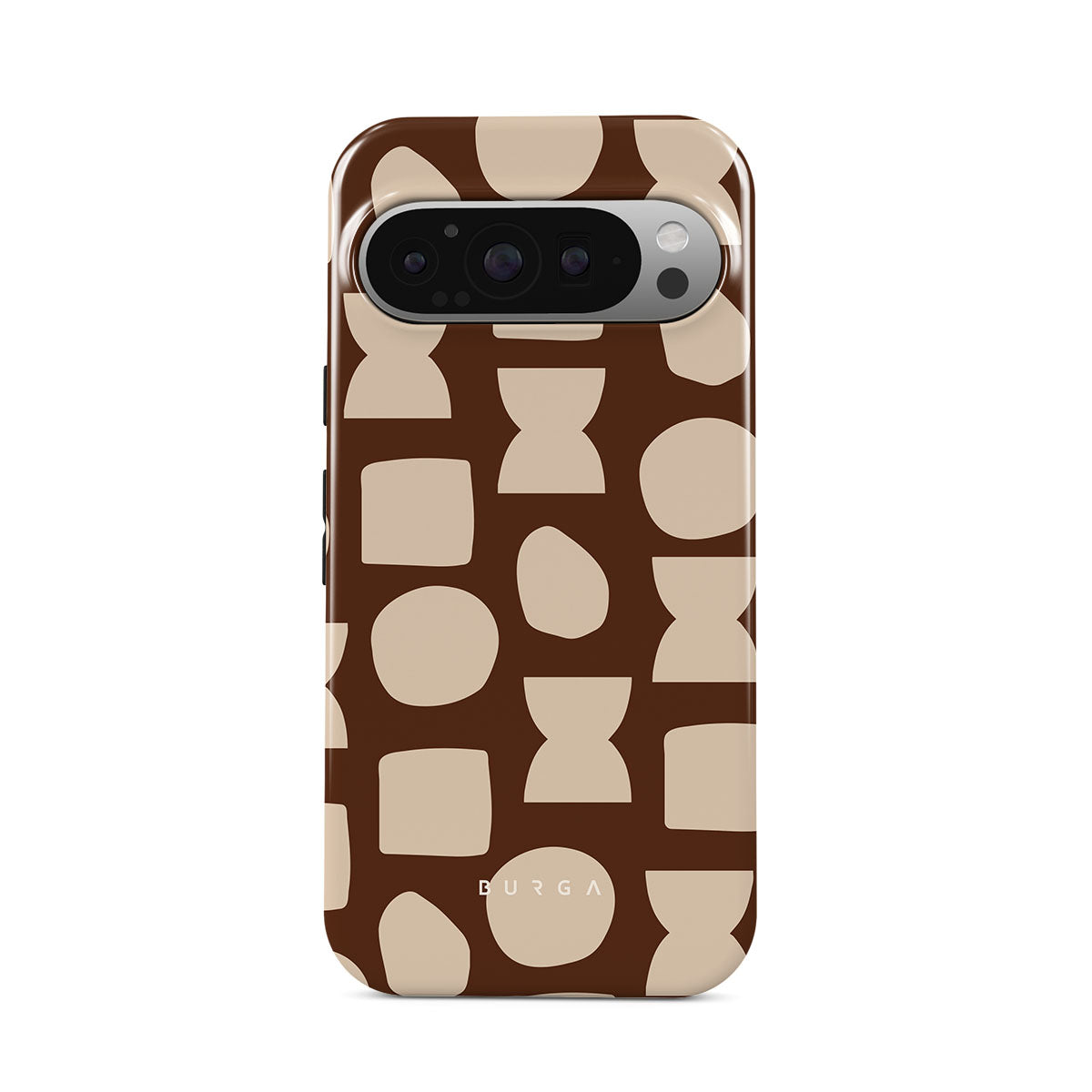 Our Terracotta Google Pixel 9 Pro XL phone case design whispers warmth and grounded energy. Against a rich brown background, an interplay of light shapes unfolds, captivating the eye with an array of circles, squares, and hourglasses. Each shape is a testament to the beauty found in simplicity.