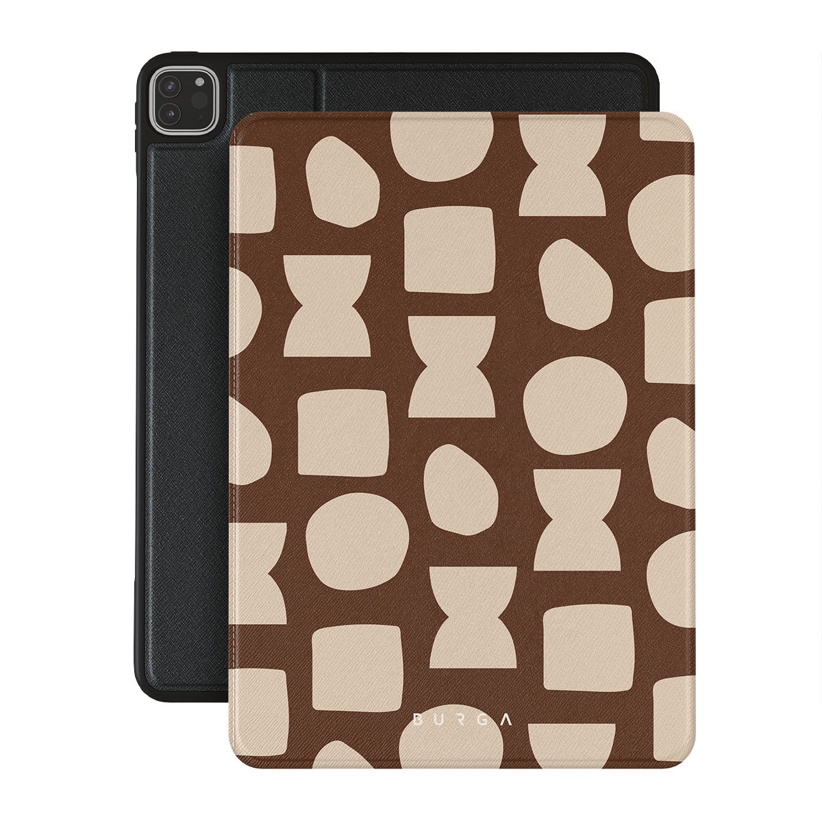Our Terracotta iPad Pro 12.9 (6th/5th Gen) folio case design whispers warmth and grounded energy. Against a rich brown background, an interplay of light shapes unfolds, captivating the eye with an array of circles, squares, and hourglasses. Each shape is a testament to the beauty found in simplicity.