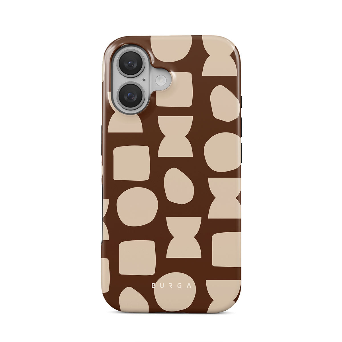 Our Terracotta iPhone 16 phone case design whispers warmth and grounded energy. Against a rich brown background, an interplay of light shapes unfolds, captivating the eye with an array of circles, squares, and hourglasses. Each shape is a testament to the beauty found in simplicity.