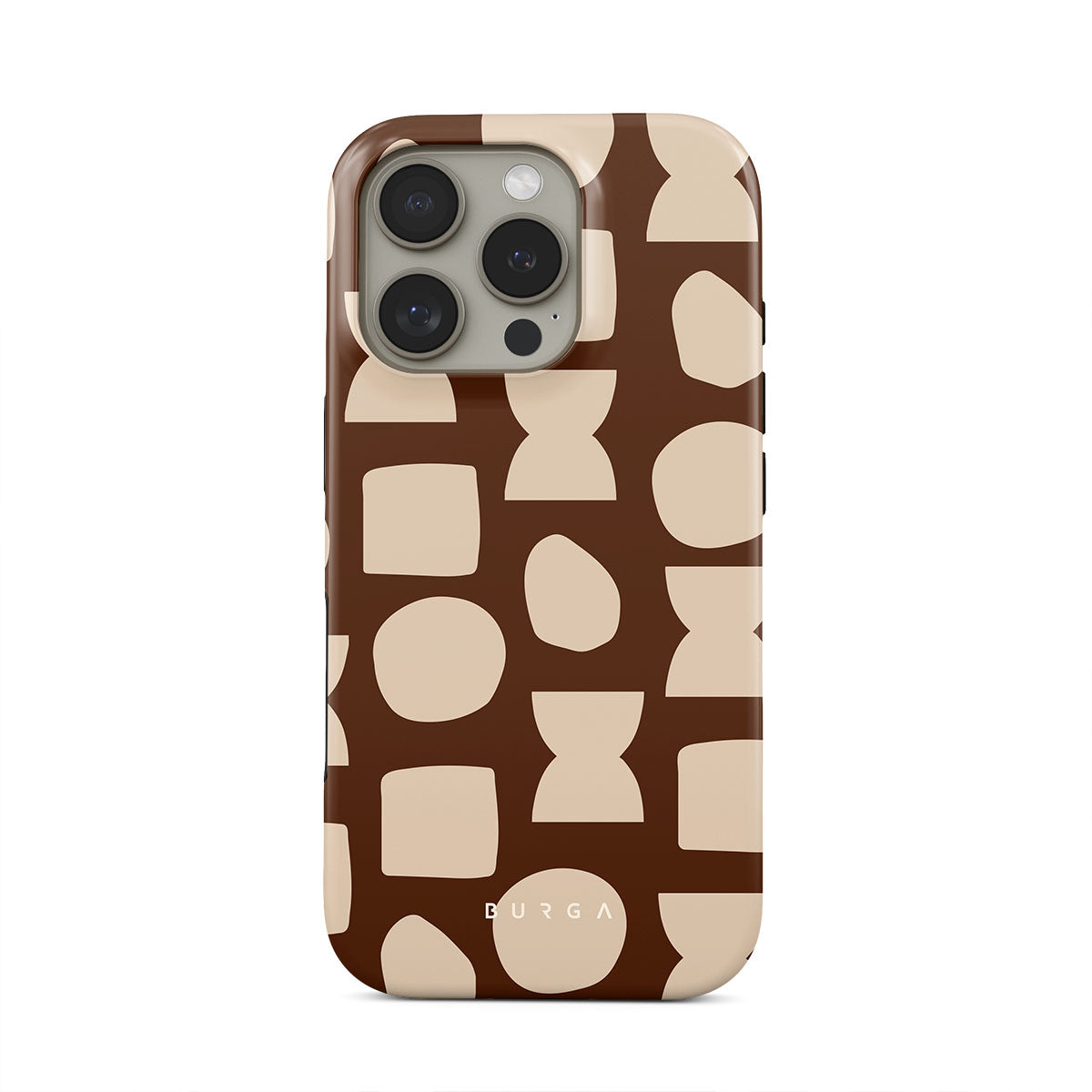 Our Terracotta iPhone 16 Pro Max phone case design whispers warmth and grounded energy. Against a rich brown background, an interplay of light shapes unfolds, captivating the eye with an array of circles, squares, and hourglasses. Each shape is a testament to the beauty found in simplicity.