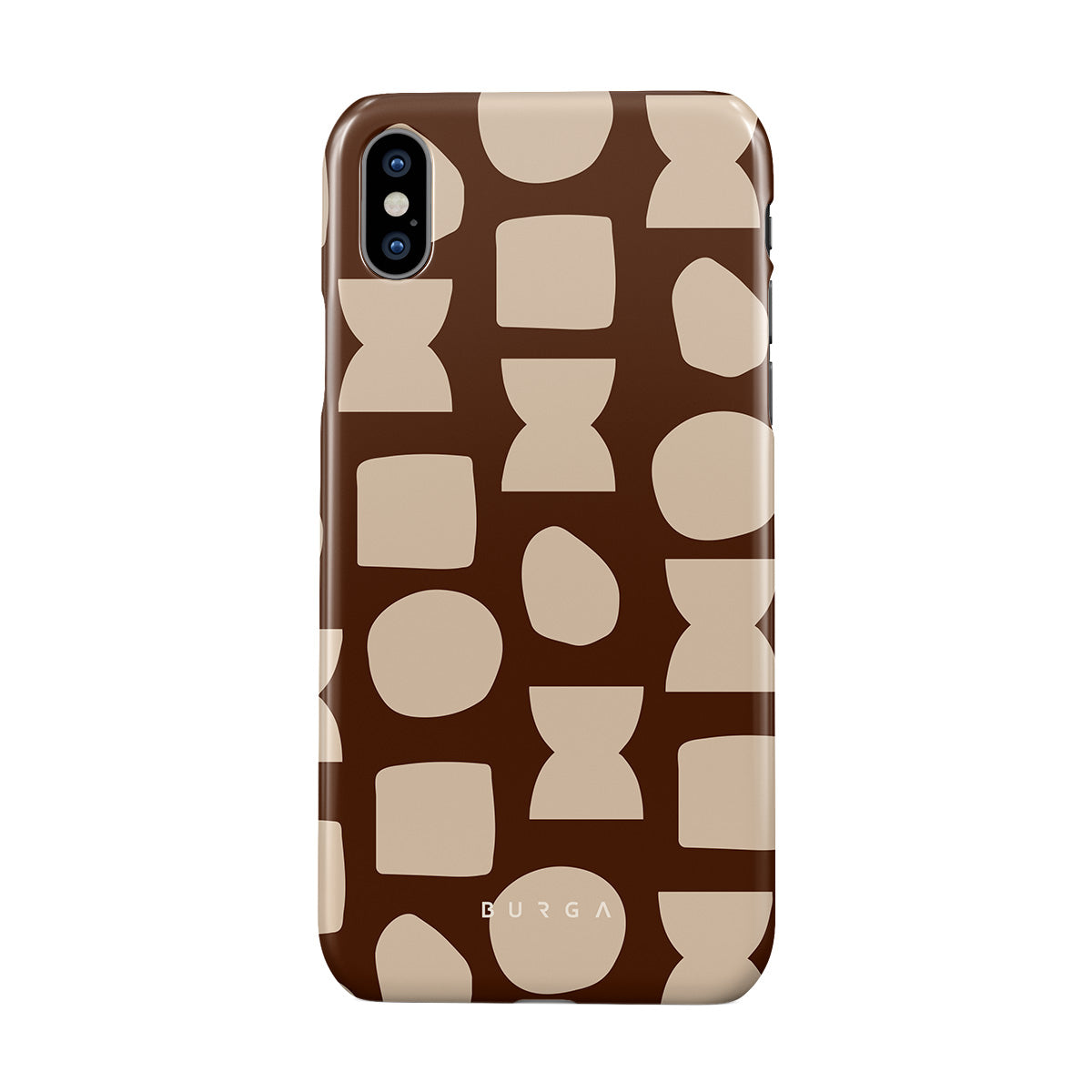 Our Terracotta iPhone X / XS phone case design whispers warmth and grounded energy. Against a rich brown background, an interplay of light shapes unfolds, captivating the eye with an array of circles, squares, and hourglasses. Each shape is a testament to the beauty found in simplicity.