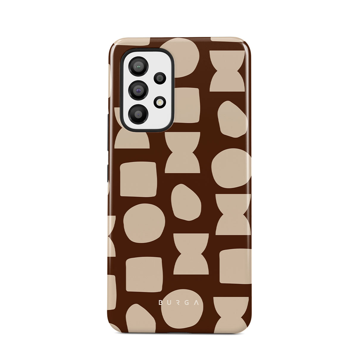 Our Terracotta Samsung Galaxy A23 4G / 5G phone case design whispers warmth and grounded energy. Against a rich brown background, an interplay of light shapes unfolds, captivating the eye with an array of circles, squares, and hourglasses. Each shape is a testament to the beauty found in simplicity.