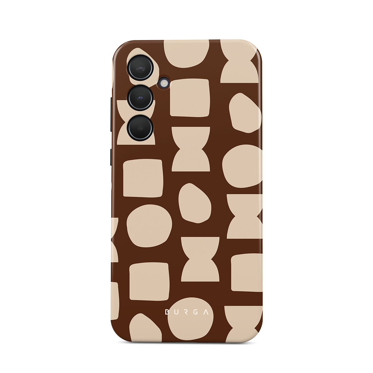Our Terracotta Samsung Galaxy A35 phone case design whispers warmth and grounded energy. Against a rich brown background, an interplay of light shapes unfolds, captivating the eye with an array of circles, squares, and hourglasses. Each shape is a testament to the beauty found in simplicity.