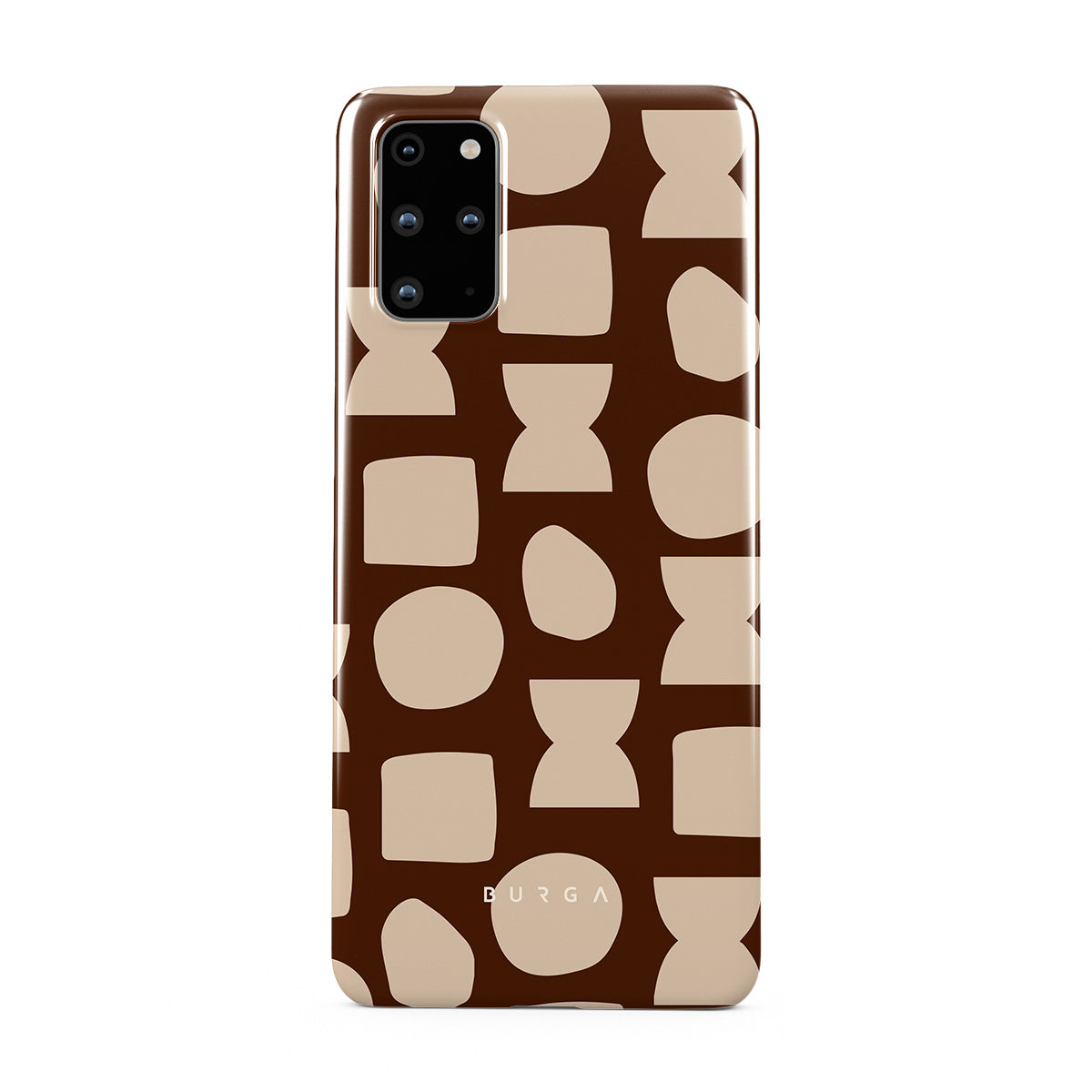 Our Terracotta Samsung Galaxy S20 Plus 4G / 5G phone case design whispers warmth and grounded energy. Against a rich brown background, an interplay of light shapes unfolds, captivating the eye with an array of circles, squares, and hourglasses. Each shape is a testament to the beauty found in simplicity.