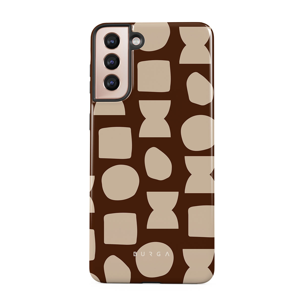 Our Terracotta Samsung Galaxy S21 Plus phone case design whispers warmth and grounded energy. Against a rich brown background, an interplay of light shapes unfolds, captivating the eye with an array of circles, squares, and hourglasses. Each shape is a testament to the beauty found in simplicity.