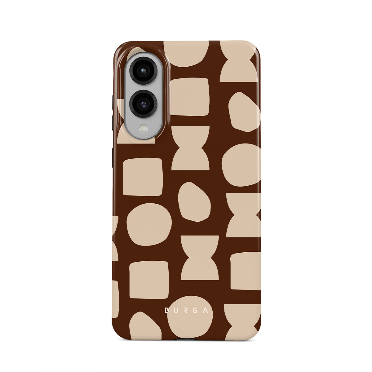 Our Terracotta Samsung Galaxy S25 Edge phone case design whispers warmth and grounded energy. Against a rich brown background, an interplay of light shapes unfolds, captivating the eye with an array of circles, squares, and hourglasses. Each shape is a testament to the beauty found in simplicity.