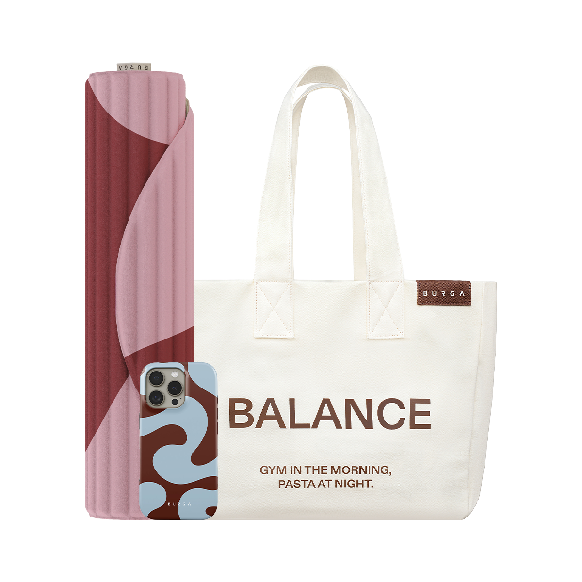 Phone protected. Mind centered. Bag in hand. Mat ready. This trio’s here for the yoga flow, the coffee run, the everything-in-between. No drama. No effort. Just balance, packed and pretty. The Active Bundle includes all you need to keep up with your life on the go: