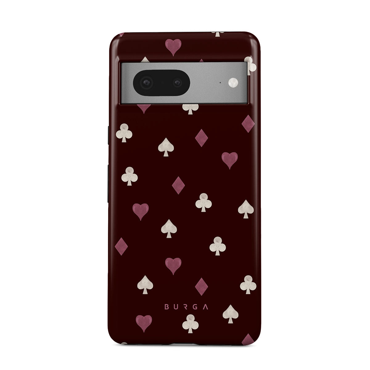 Nothing is as it appears. Hearts, clubs, diamonds, and spades—stacked in your favor or playing against you? This Google Pixel 7a phone case design features a rich burgundy background and minimalist suits that make for a game where the rules are constantly shifting.
