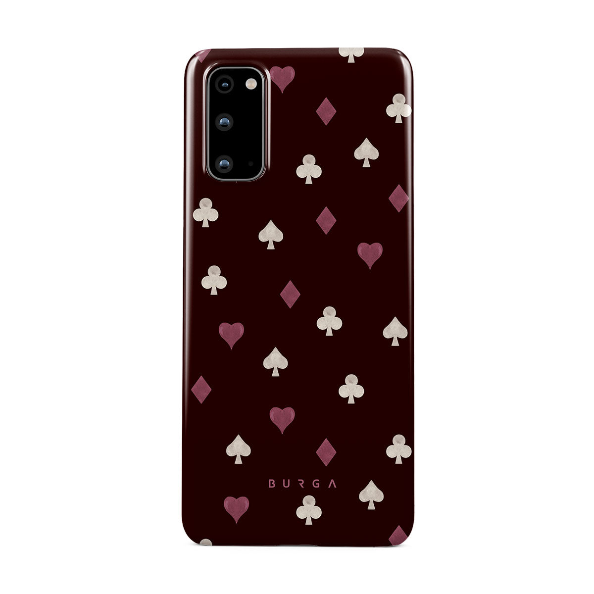 Nothing is as it appears. Hearts, clubs, diamonds, and spades—stacked in your favor or playing against you? This Samsung Galaxy S20 4G / 5G phone case design features a rich burgundy background and minimalist suits that make for a game where the rules are constantly shifting.