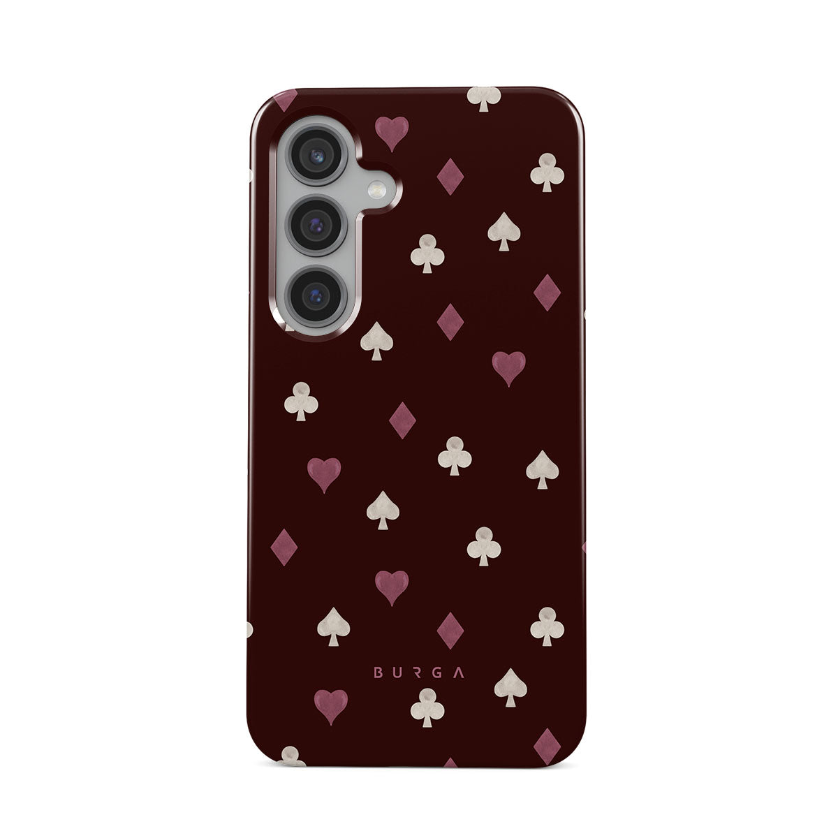 Nothing is as it appears. Hearts, clubs, diamonds, and spades—stacked in your favor or playing against you? This Samsung Galaxy S24 Plus phone case design features a rich burgundy background and minimalist suits that make for a game where the rules are constantly shifting.