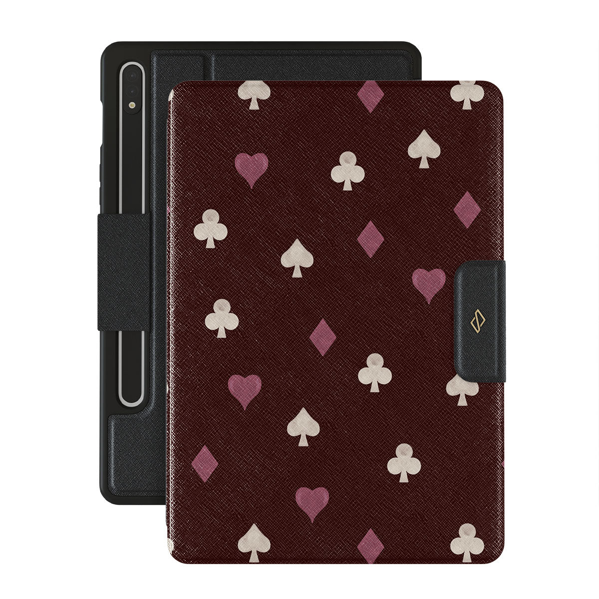 Nothing is as it appears. Hearts, clubs, diamonds, and spades—stacked in your favor or playing against you? This Samsung Galaxy Tab S9 FE folio case design features a rich burgundy background and minimalist suits that make for a game where the rules are constantly shifting.