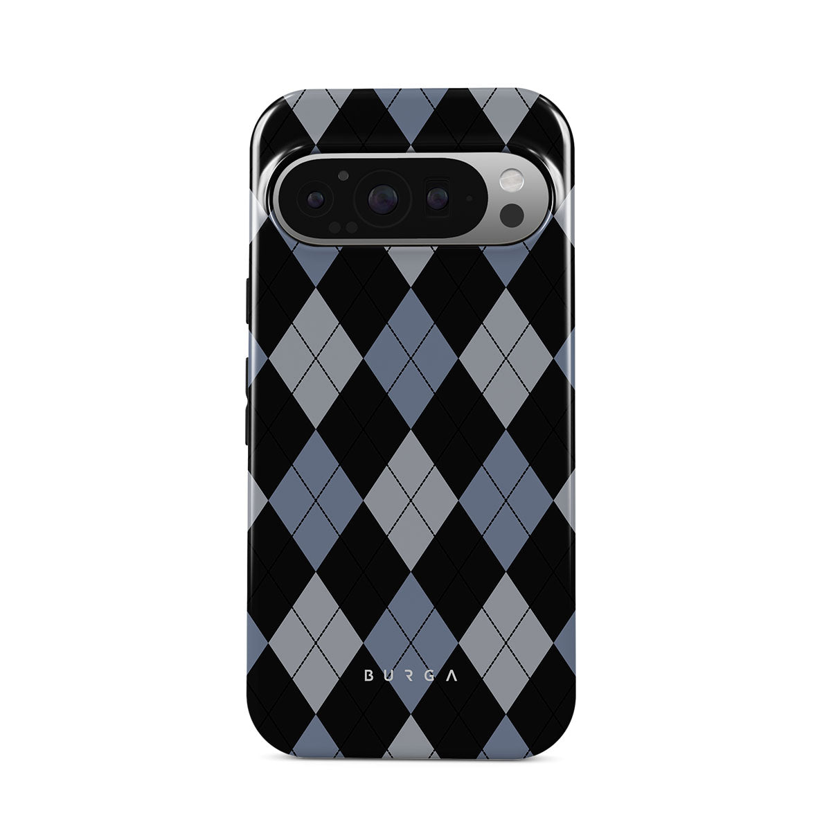 Discover our Trouble Google Pixel 9 Pro phone case design—a classic argyle pattern featuring stark black diamonds that seamlessly blend with two distinct shades of blue. Made for those who respect the classics but aren't afraid to disrupt the norm.