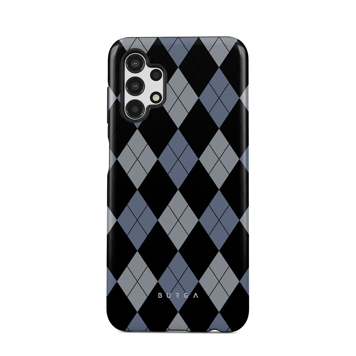 Discover our Trouble Samsung Galaxy A13 4G phone case design—a classic argyle pattern featuring stark black diamonds that seamlessly blend with two distinct shades of blue. Made for those who respect the classics but aren't afraid to disrupt the norm.