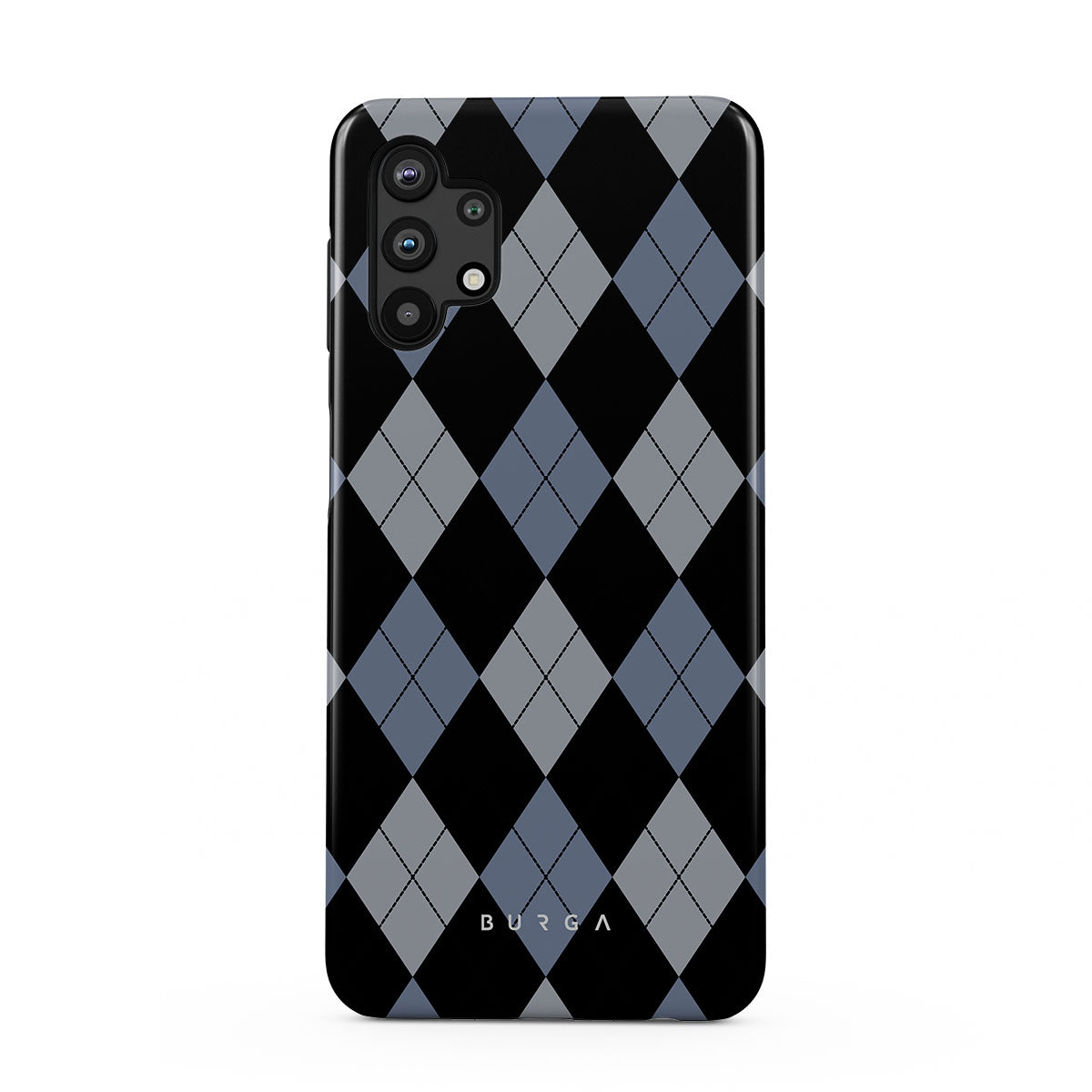Discover our Trouble Samsung Galaxy A32 5G phone case design—a classic argyle pattern featuring stark black diamonds that seamlessly blend with two distinct shades of blue. Made for those who respect the classics but aren't afraid to disrupt the norm.