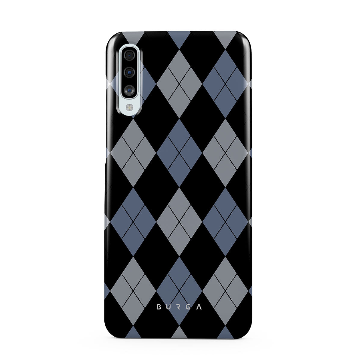 Discover our Trouble Samsung Galaxy A50 phone case design—a classic argyle pattern featuring stark black diamonds that seamlessly blend with two distinct shades of blue. Made for those who respect the classics but aren't afraid to disrupt the norm.